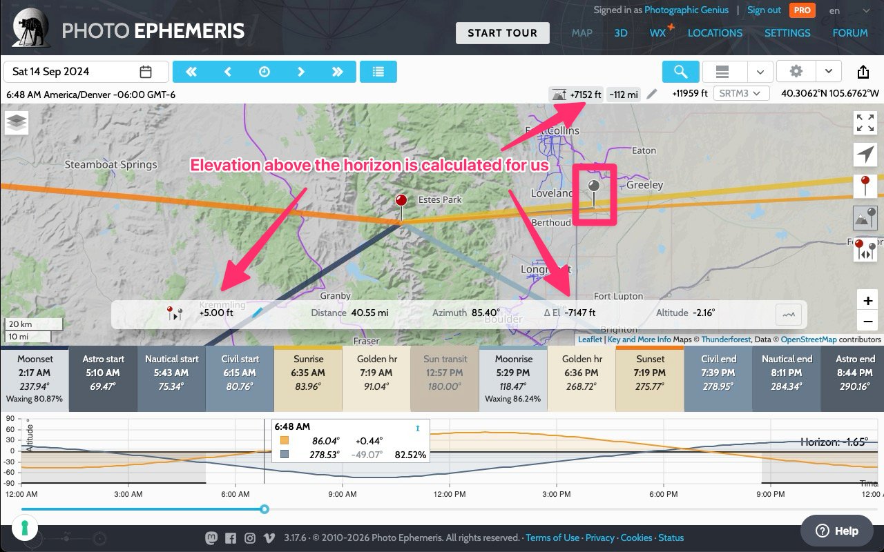 Knowing that the plains are just that – plains, and therefore flat – we can use our roughly positioned grey pin to set the elevation at the horizon. TPE knows the elevation at both red and grey pin positions, so can take the difference to calculate the elevation above the horizon, which is the number we need to adjust the rise and set times.