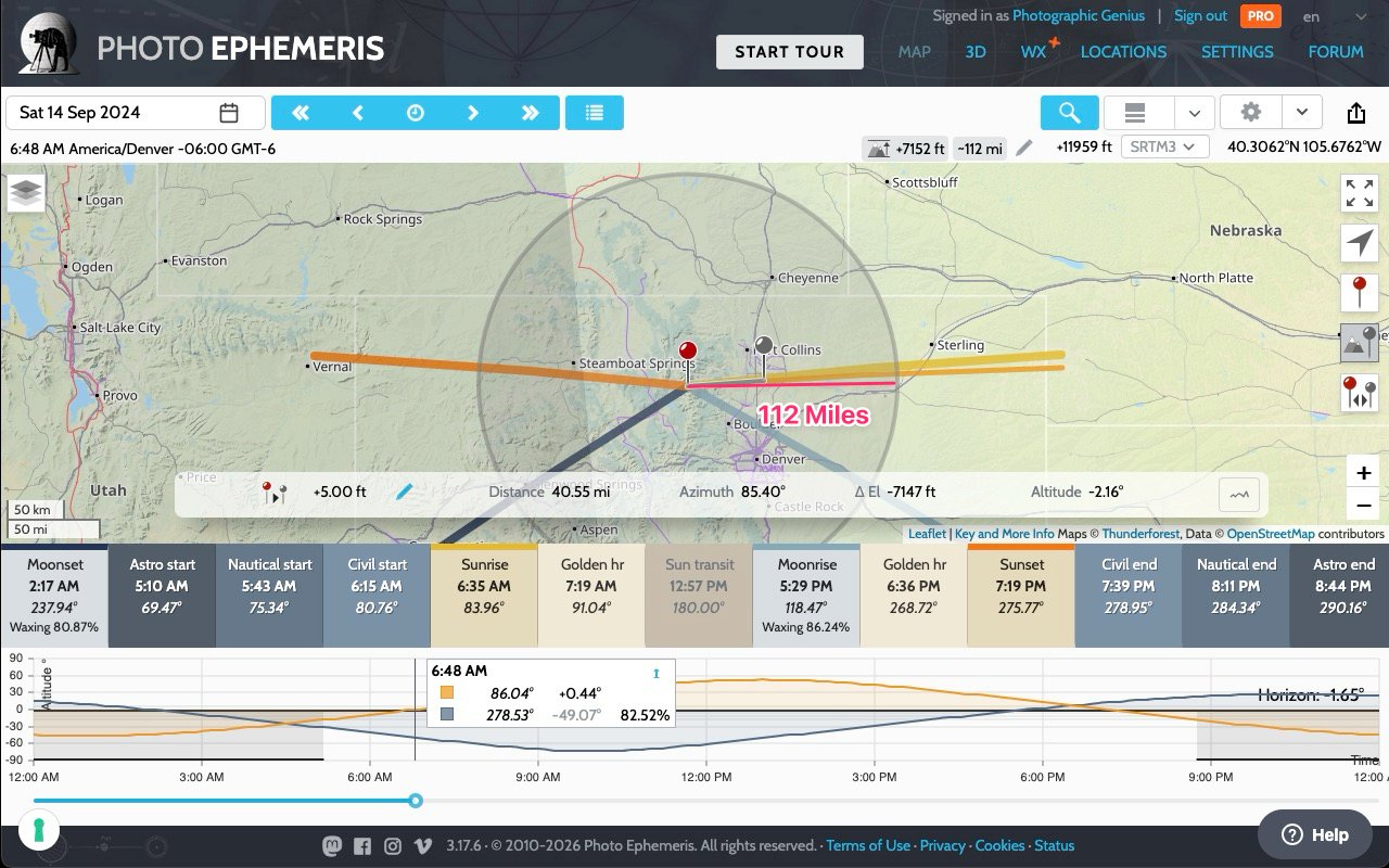 Zoom out so you can see the plains of eastern Colorado as shown. Move the grey pin out along the sunrise azimuth line, dropping it somewhere beyond Interstate 25/Highway 87. Finally, advance the time slider a few minutes to 6:48 a.m. so we know the sun is fully above the horizon.