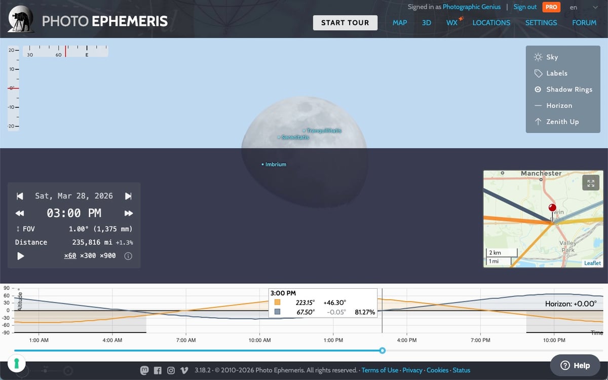 Si vous ajustez l’heure de la journée avec le curseur temporel, vous verrez l’apparence de la Lune changer. Si vous déplacez l’épingle sur la carte, vous n’affecterez pas des éléments comme la fraction illuminée de la Lune, mais l’orientation par rapport à l’observateur changera (en raison de l’angle parallactique).