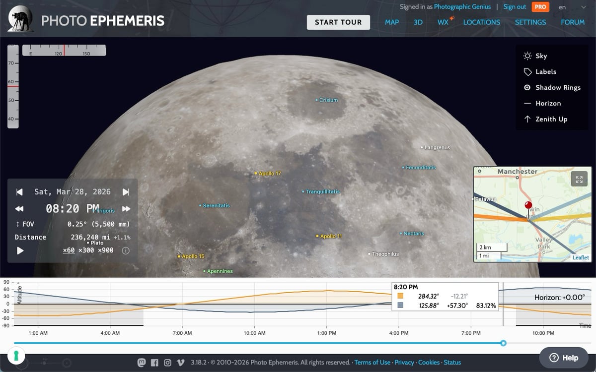Le Simulateur lunaire dans TPE (The Photographer’s Ephemeris) Web fournit une vue interactive et détaillée de la Lune telle qu’elle est observée depuis l’emplacement sélectionné sur la carte. Il est synchronisé avec le curseur temporel et la vue carte, ce qui vous permet d’explorer la phase lunaire, l’orientation, la libration et (le cas échéant) la géométrie des éclipses.